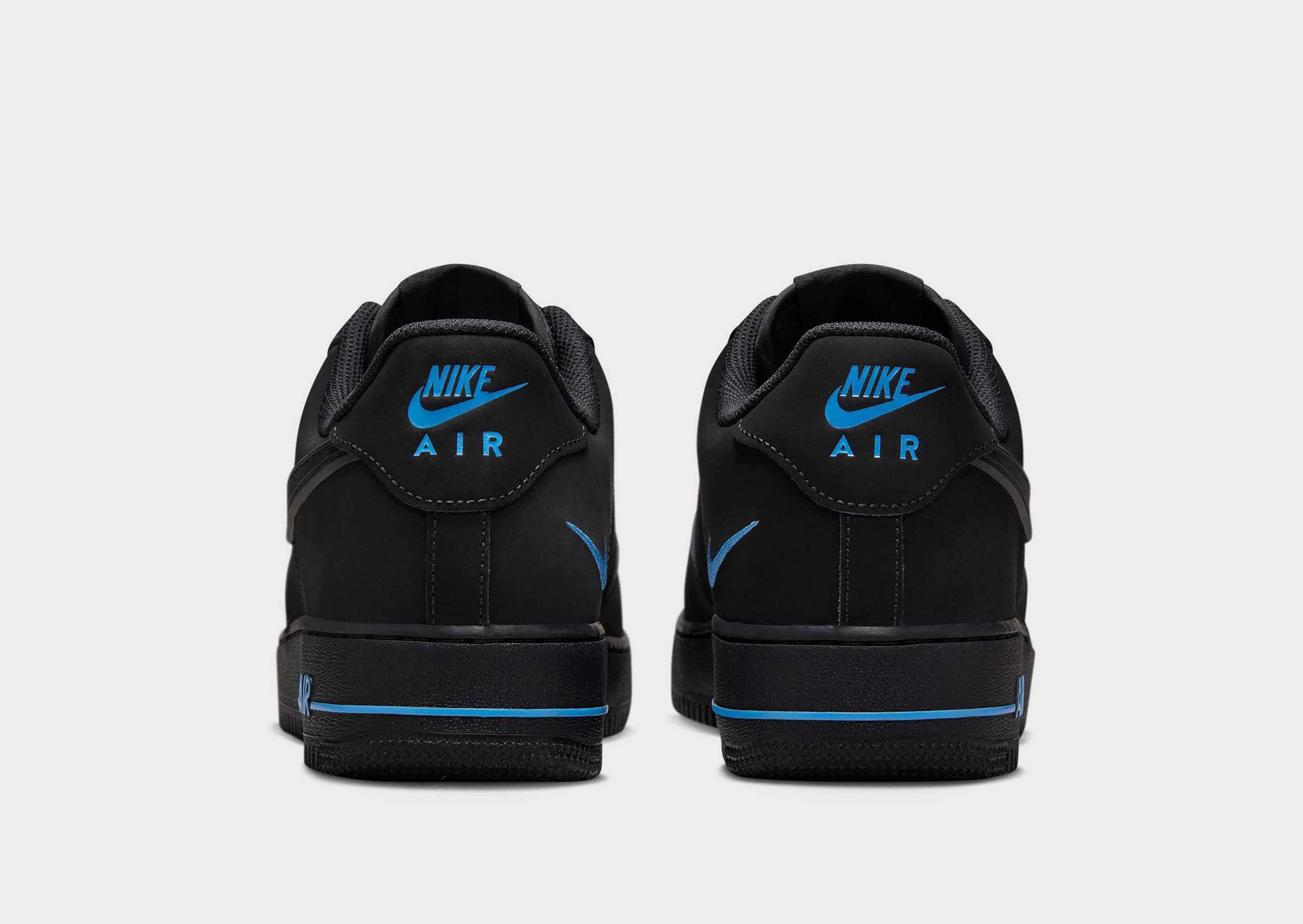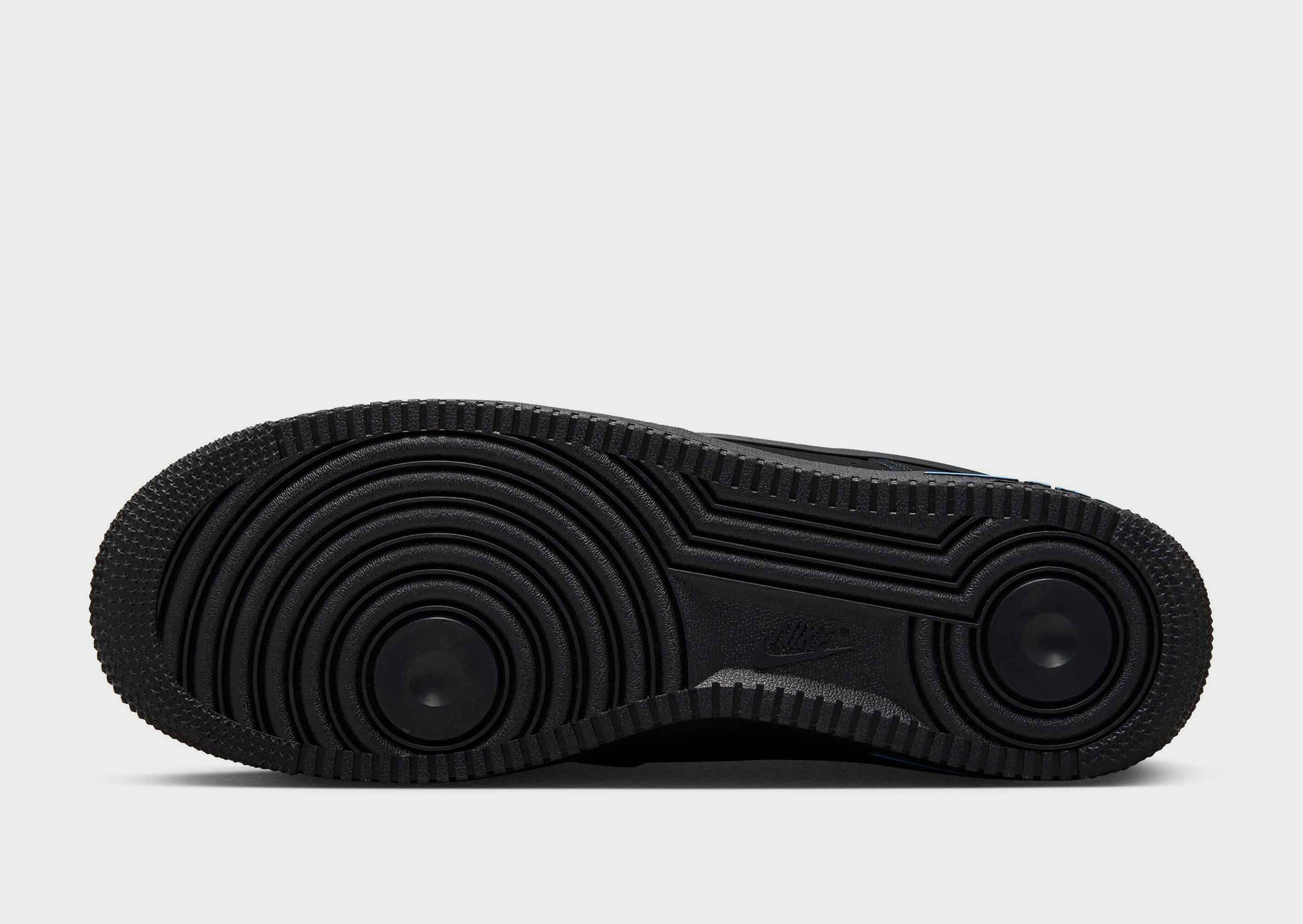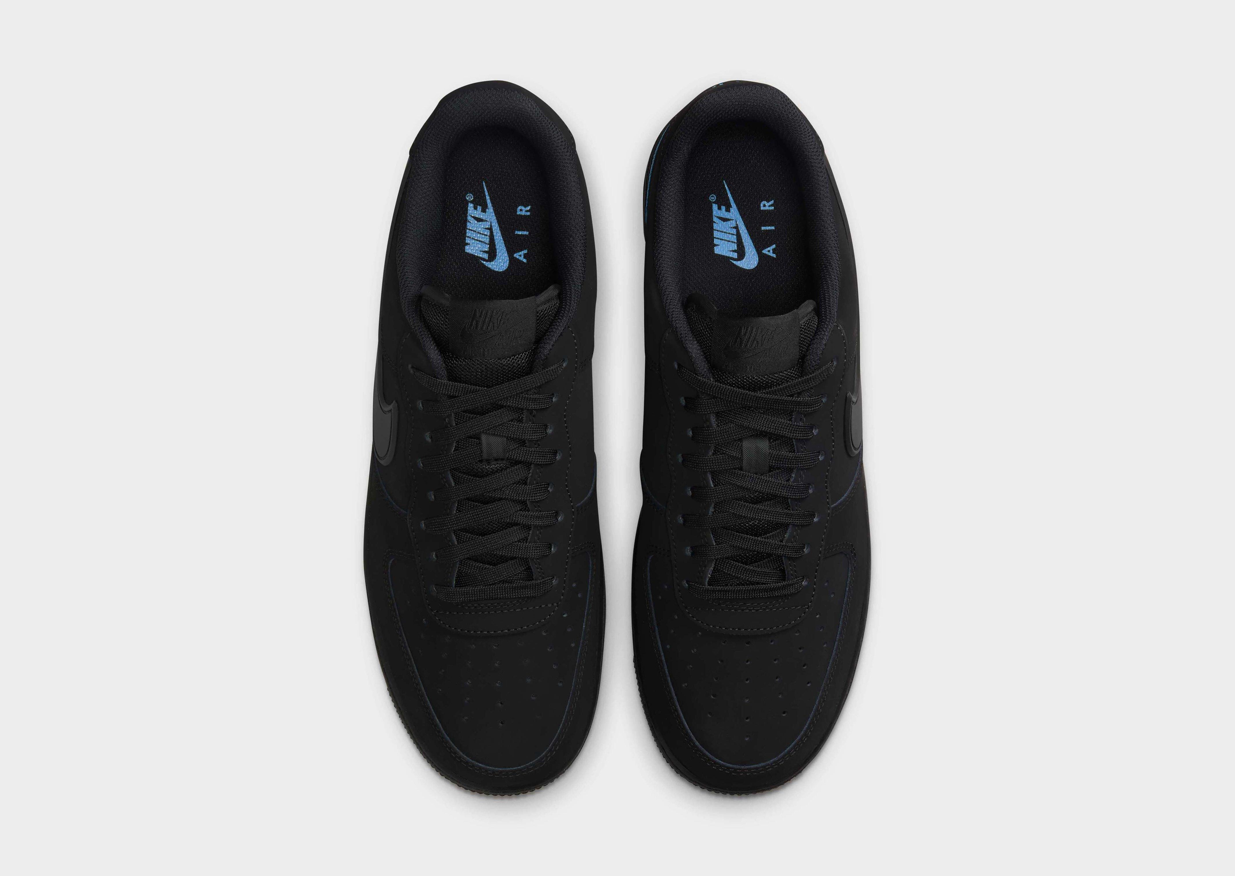 Rep the Swoosh as you step out in these men’s Air Force 1 Low trainers from Nike. In a Black colourway with University Blue accents, these JD-exclusive sneaks have a smooth leather upper with a perforated toe box for cool comfort. They feature a lace fastening to keep you locked in, with a padded collar for extra support. Underfoot, they have a grippy rubber outsole with heritage hoops pivot circles for total traction. Finished up with Nike branding on the tongue and heel, with the Swoosh logo to the sidewalls.
