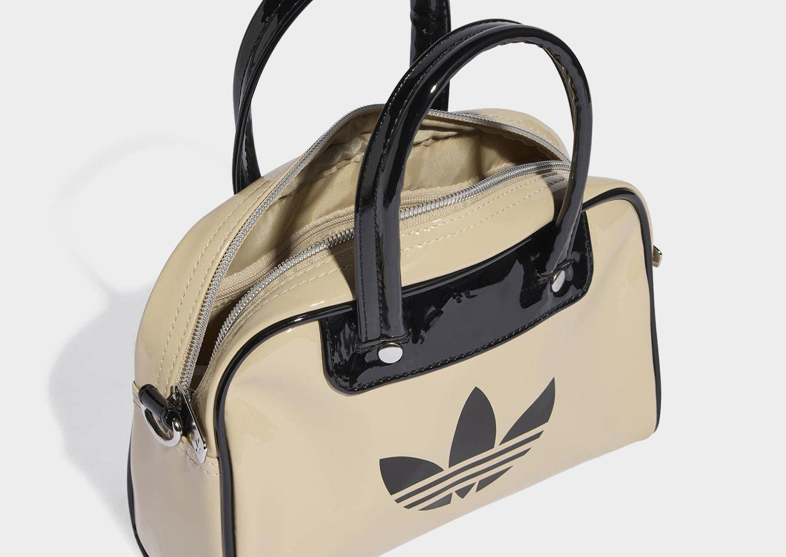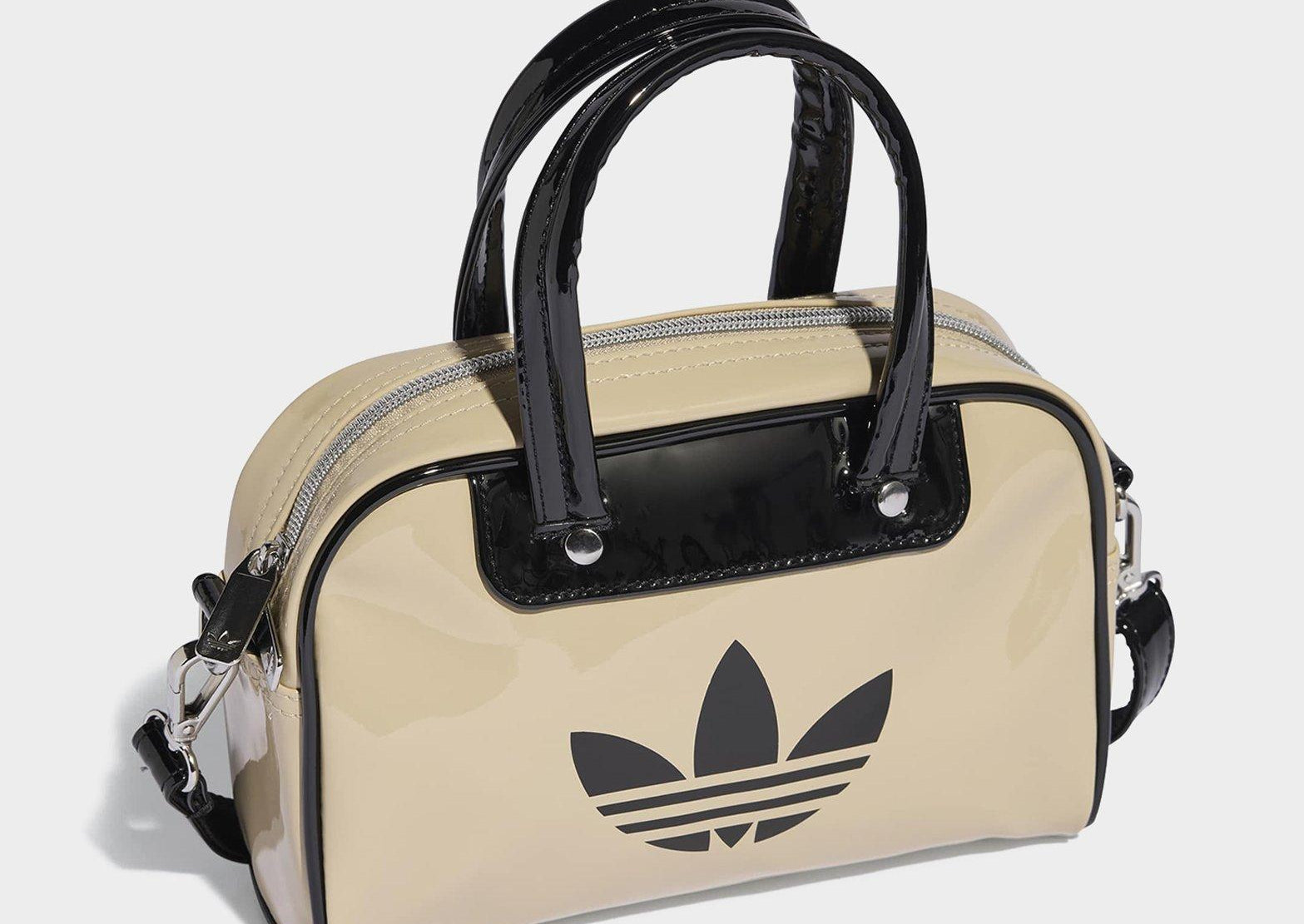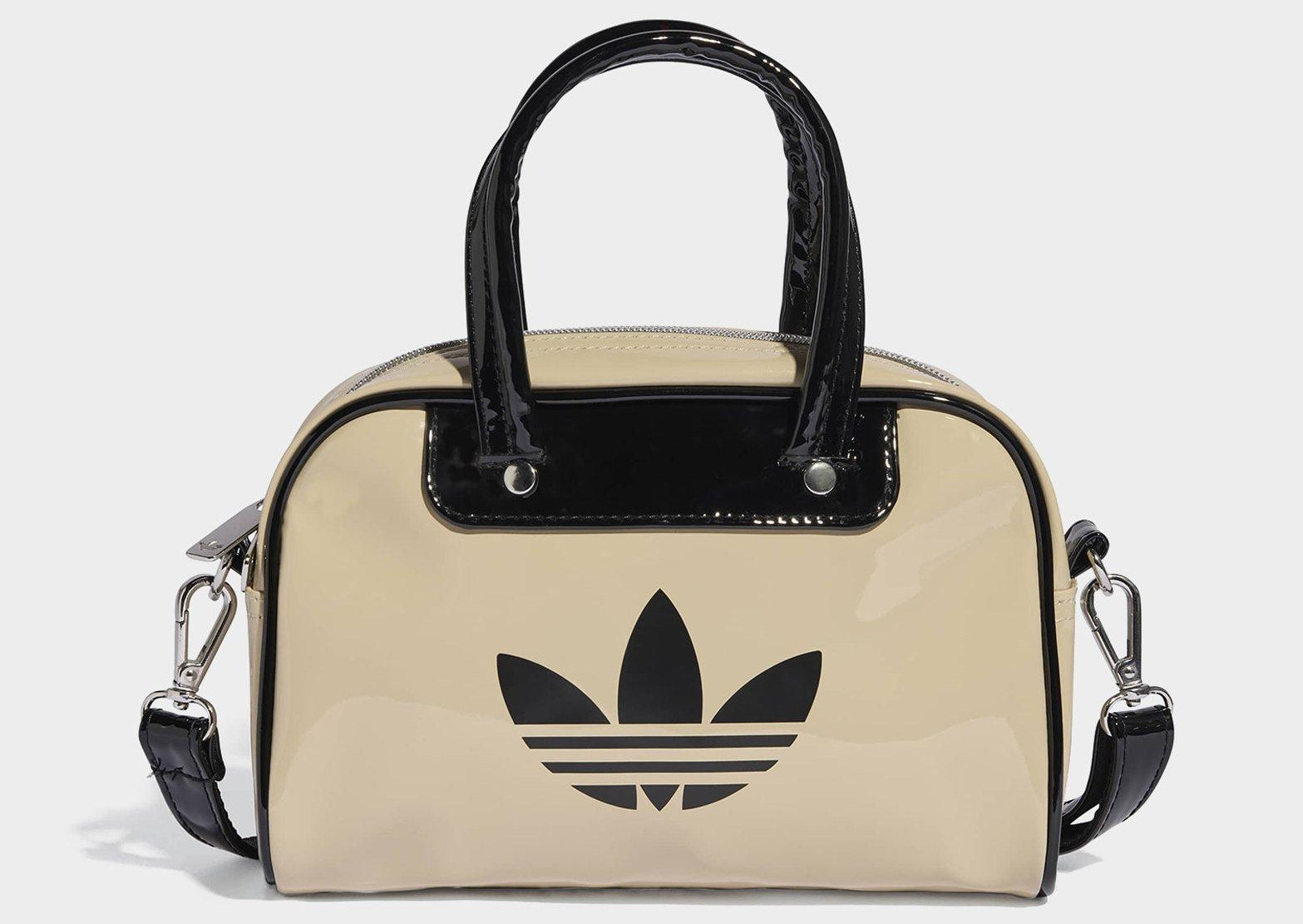 Based on an archival style, this Adicolor Mini Bowling Bag from adidas lets you tote your essentials in retro-inspired flair. Whether you sling it over your shoulder or grab it by the handles, this bag's shiny patent finish and contrast details make a stylish statement. An adjustable, detachable strap offers carrying options and metal rivets add a premium touch. The shiny Trefoil signs off the look.