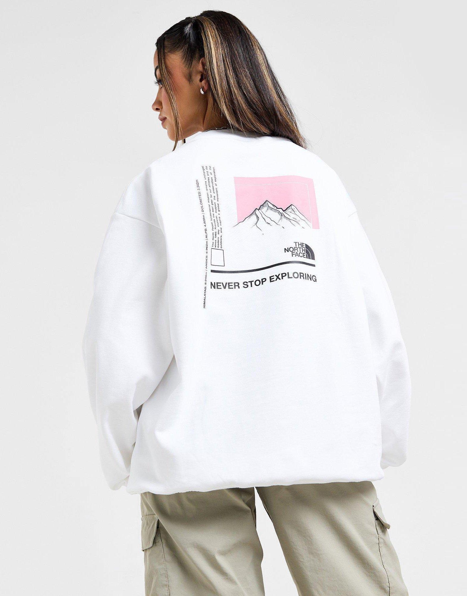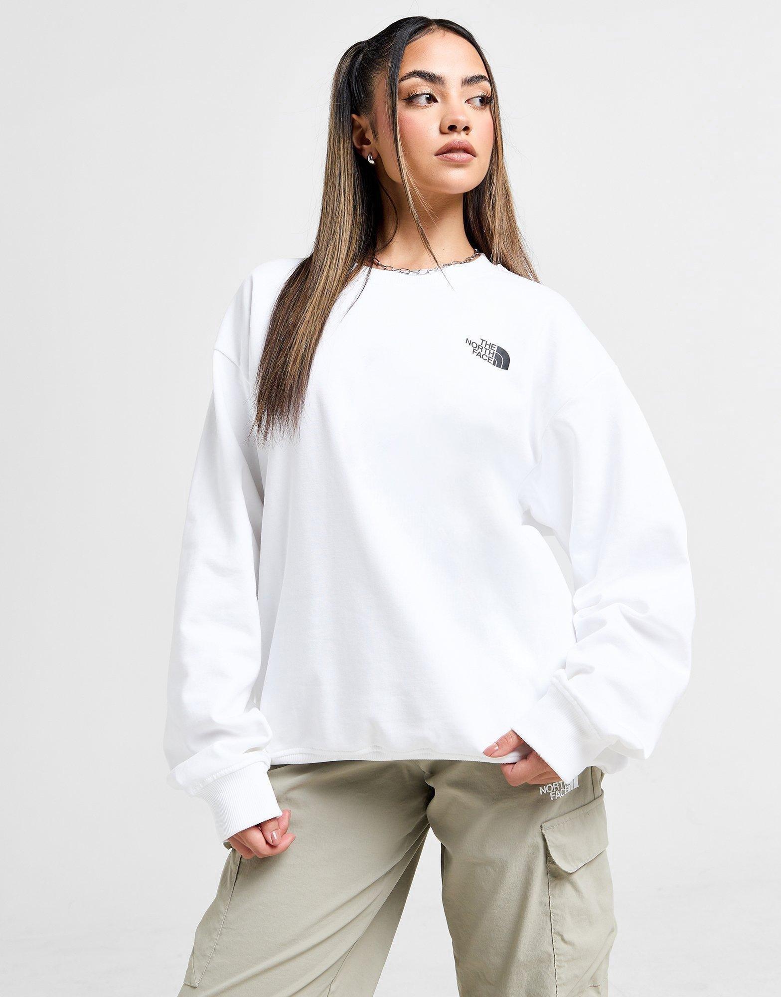 Exclusive to JD. Freshen up your off-duty staples with this women's Mountain Box Logo Crew Sweatshirt from The North Face. In a White colourway, this sweatshirt is made with a super-soft cotton-blend fleece for lasting comfort. It fits oversized for a laidback feel, and features a ribbed crew neckline and baggy long sleeves with stretchy cuffs to secure the fit. Finished with a bold The North Face branded box logo stamped to the back, and a downsized logo at the chest. Machine washable | Our model is 5'7" and wears a size small.