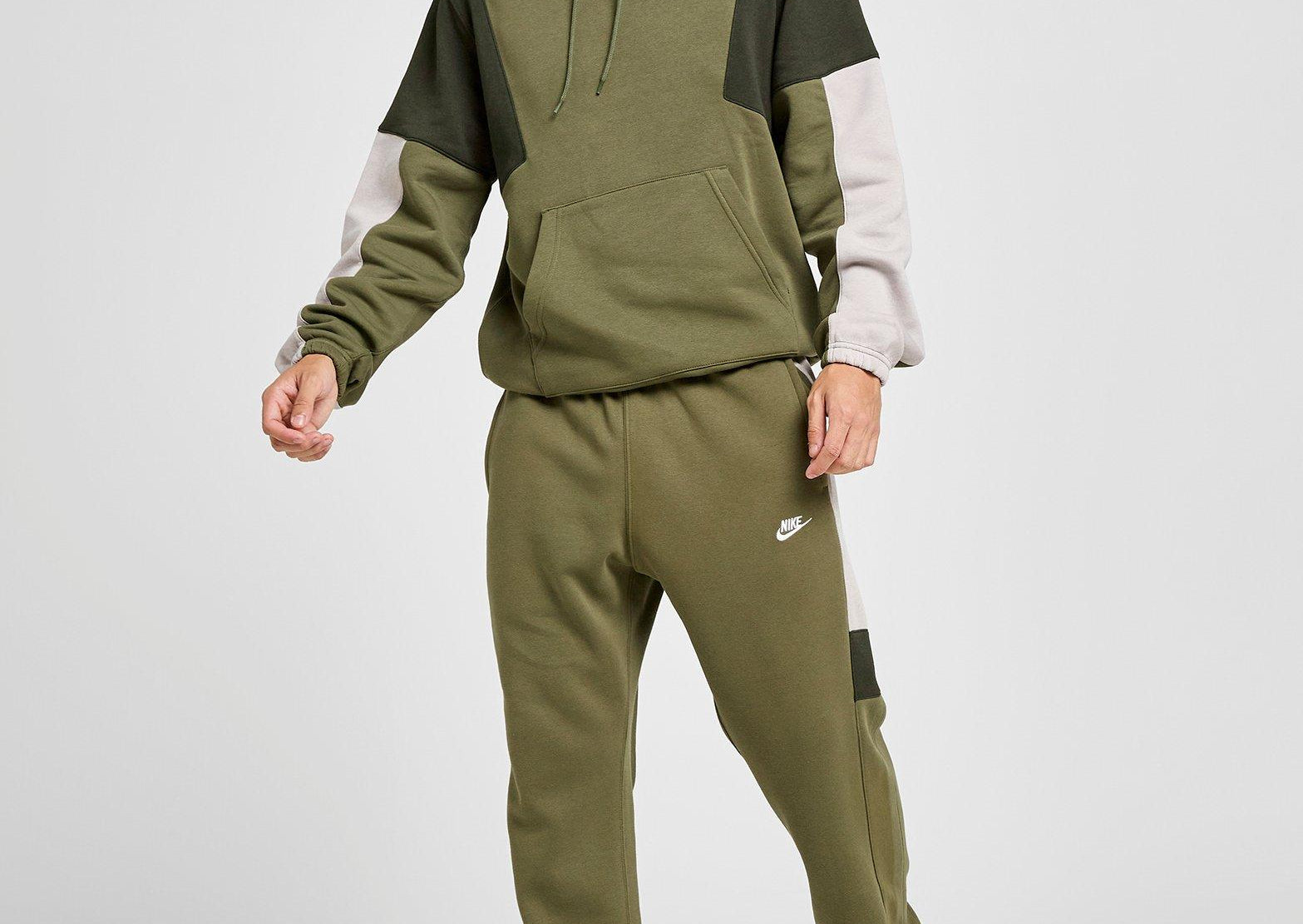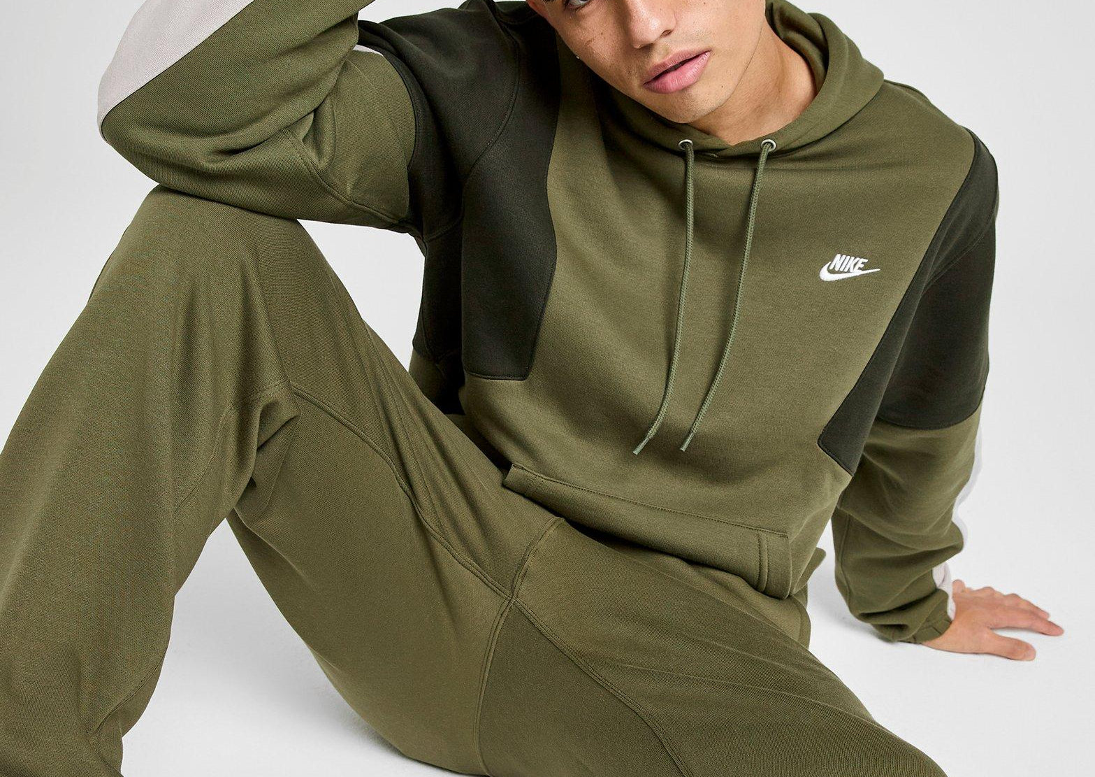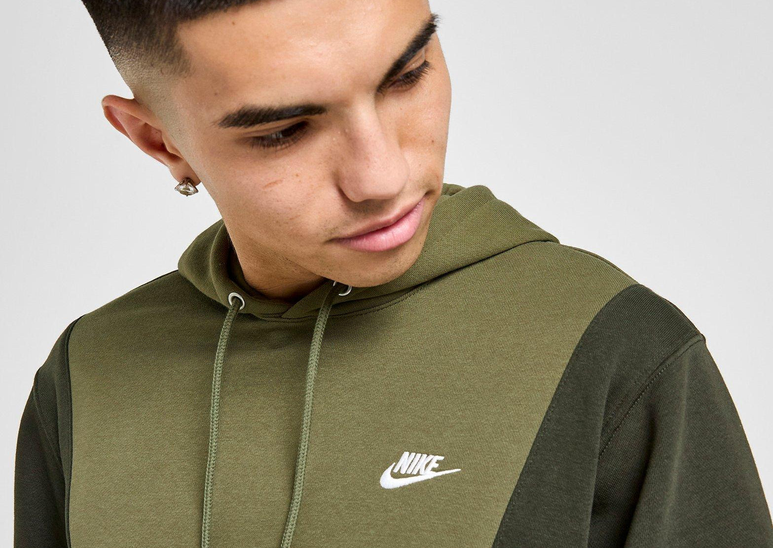 Update your layer game. This men's Club Fleece Colour Block Hoodie from Nike feels soft and fleecy. It features a pullover, adjustable hood for custom coverage. Ribbed trims hold the shape. A kangaroo pouch offers easy access to your essentials. Landing in Medium Olive and Sequoia, it's finished with the Futura logo to the chest. Machine washable | Our model is 6'0" with a 36" chest and wears a size M.
