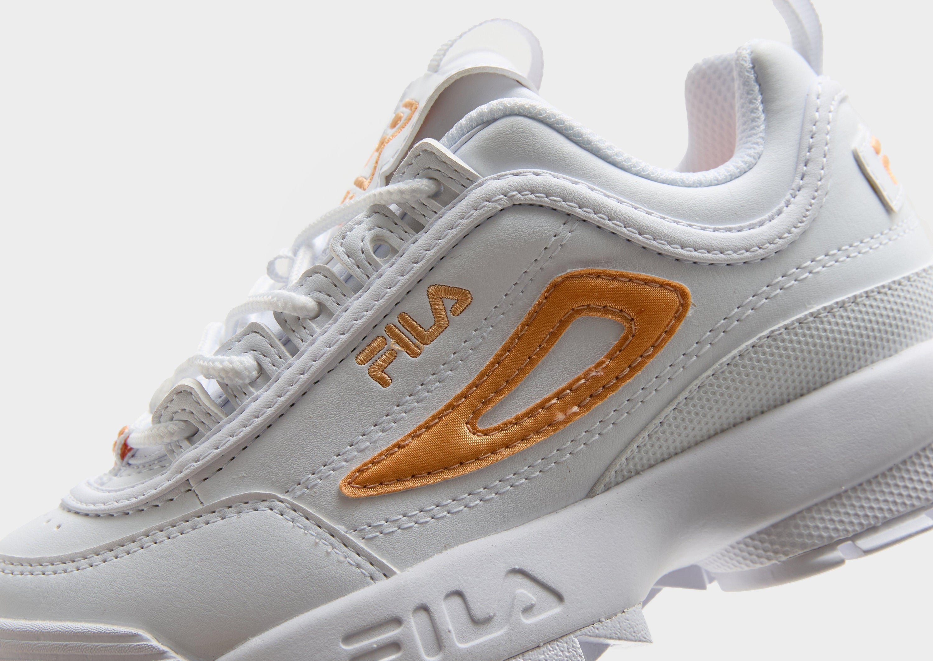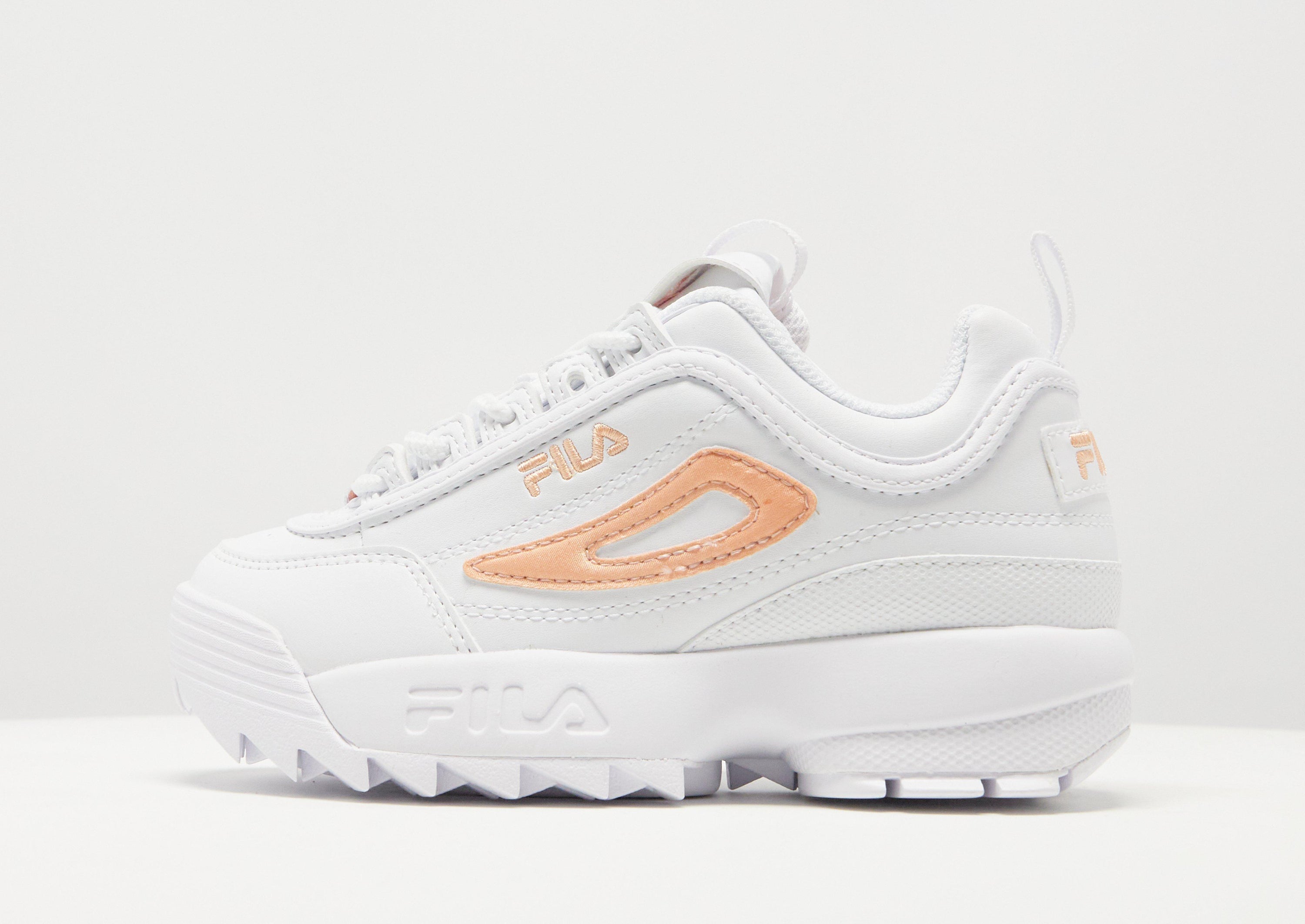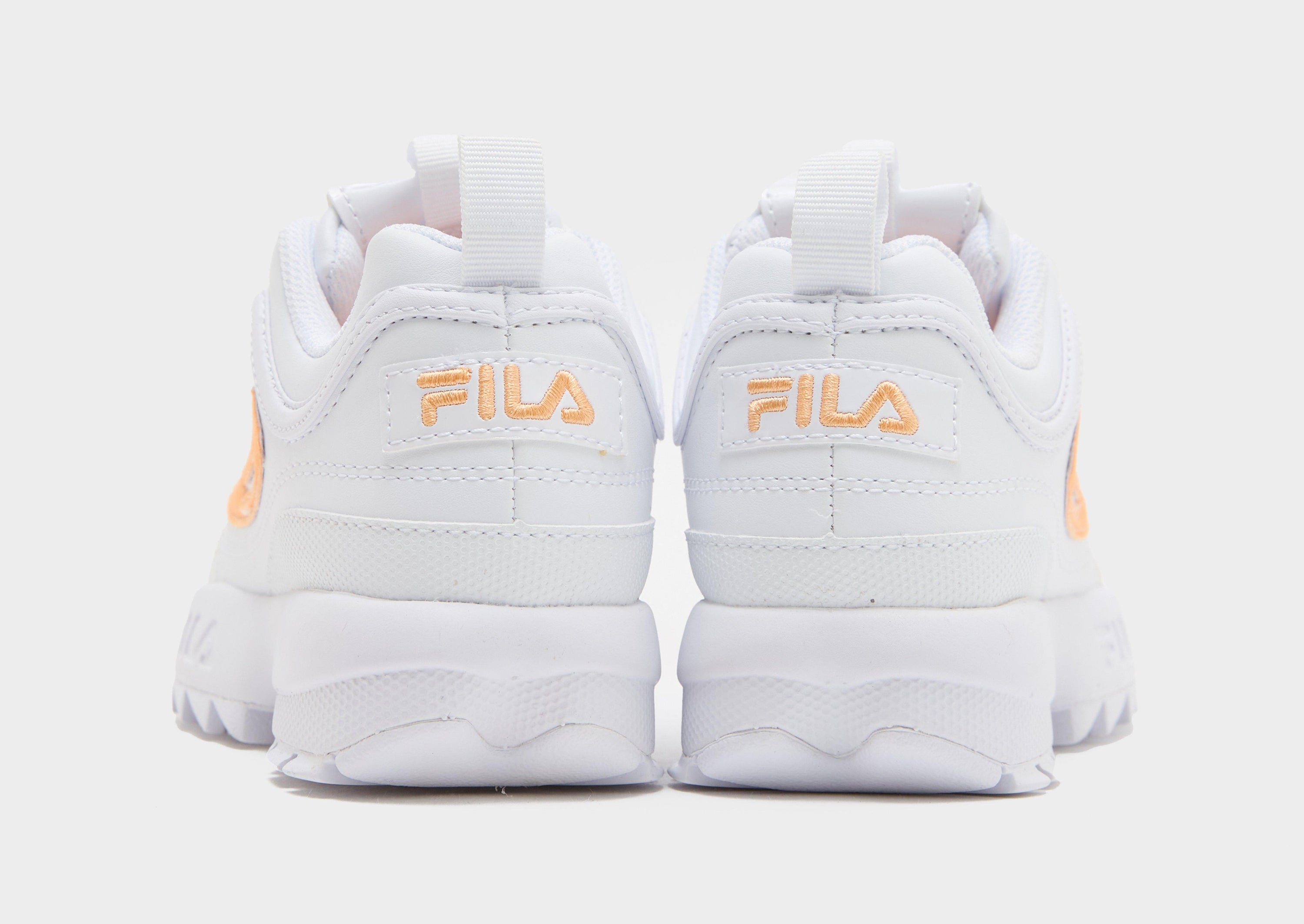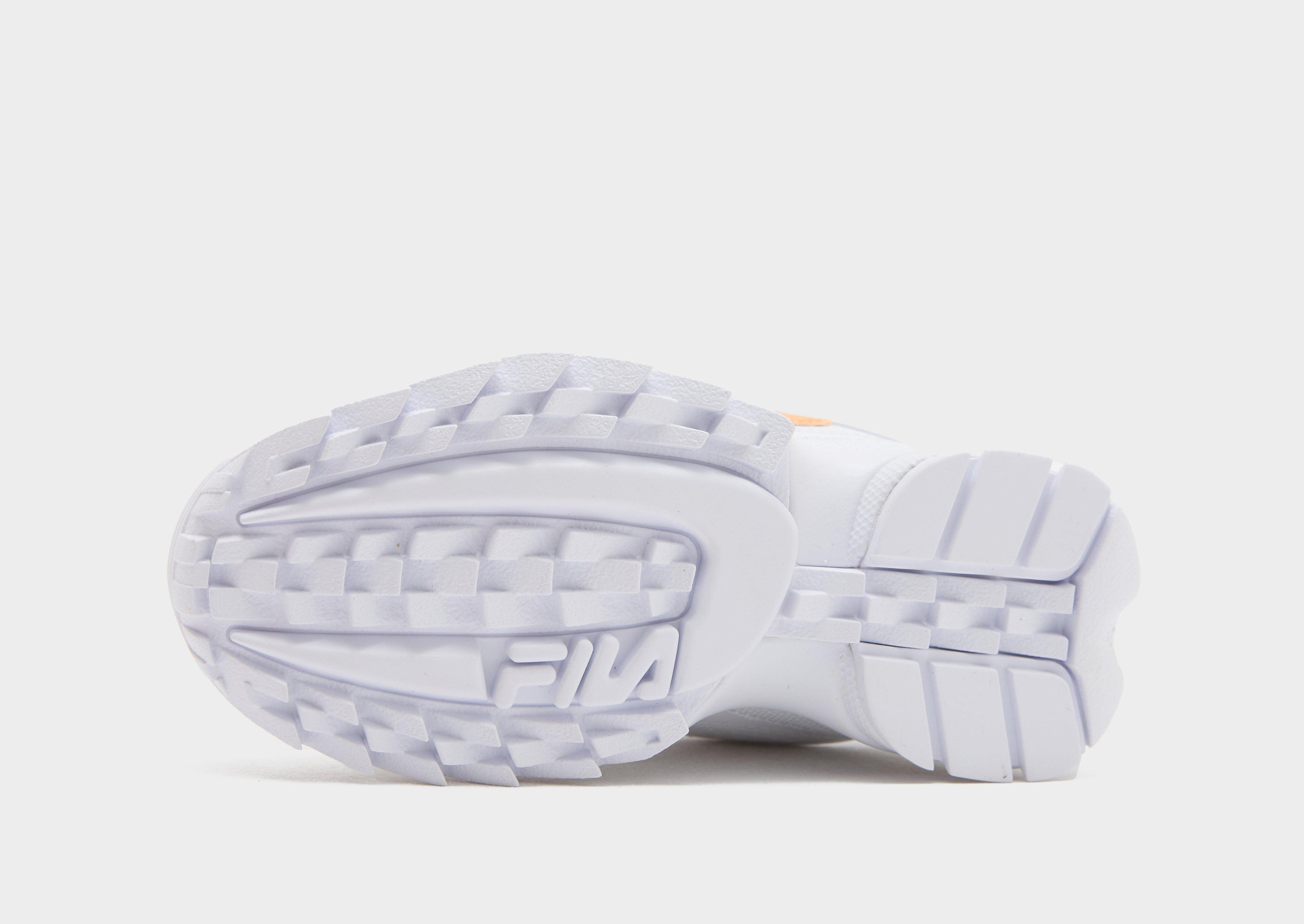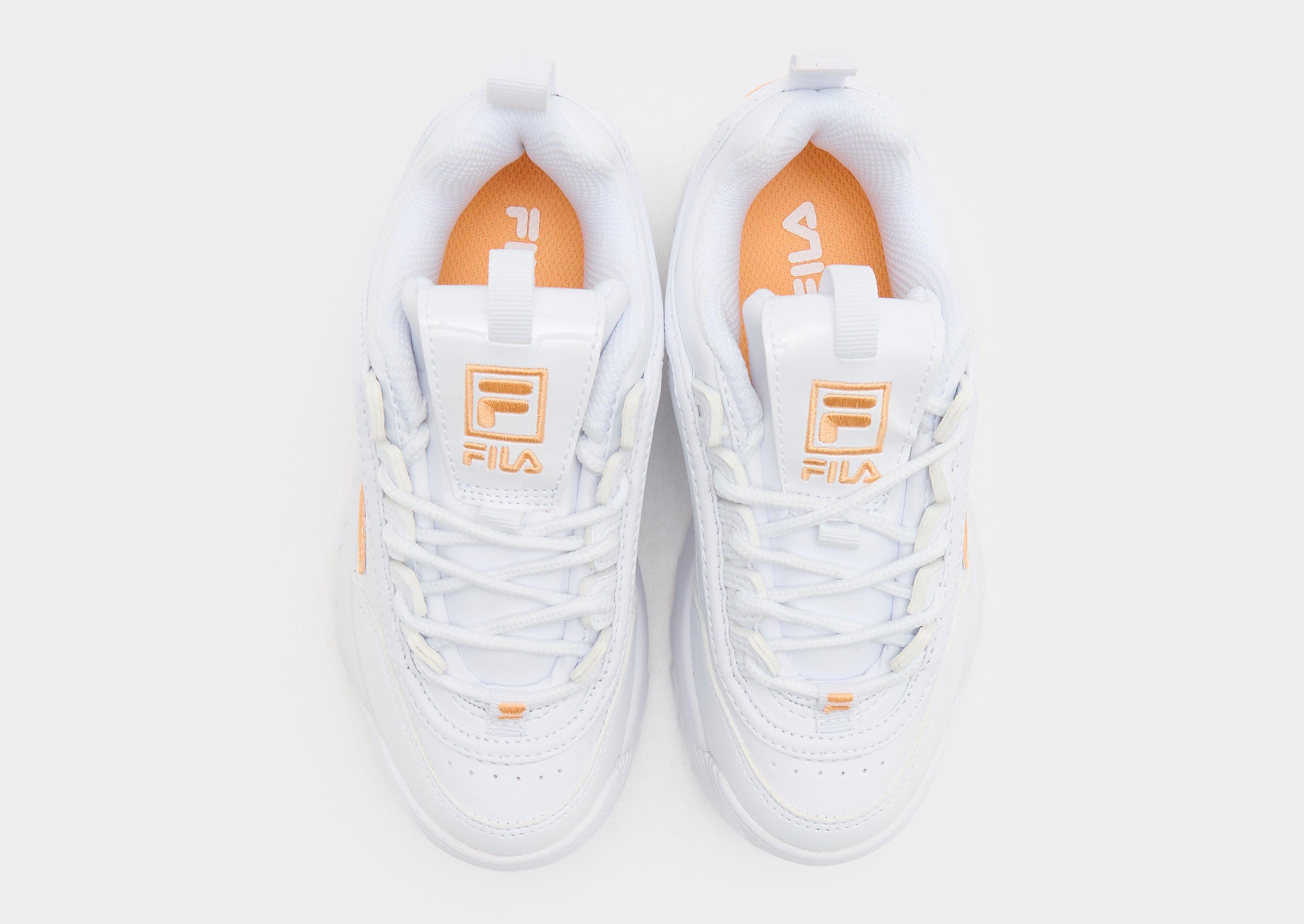 Big attitude. Little feet. These children's Disruptor sneakers from Fila keep them going in JD-exclusive style. Landing in White, these trainers have a layered synthetic upper. Tongue and heel pulls offer easy on-and-off, while the chunky midsole cushions their step. With sawtooth rubber tread for bold grip, they're finished with Orange Fila branding.