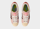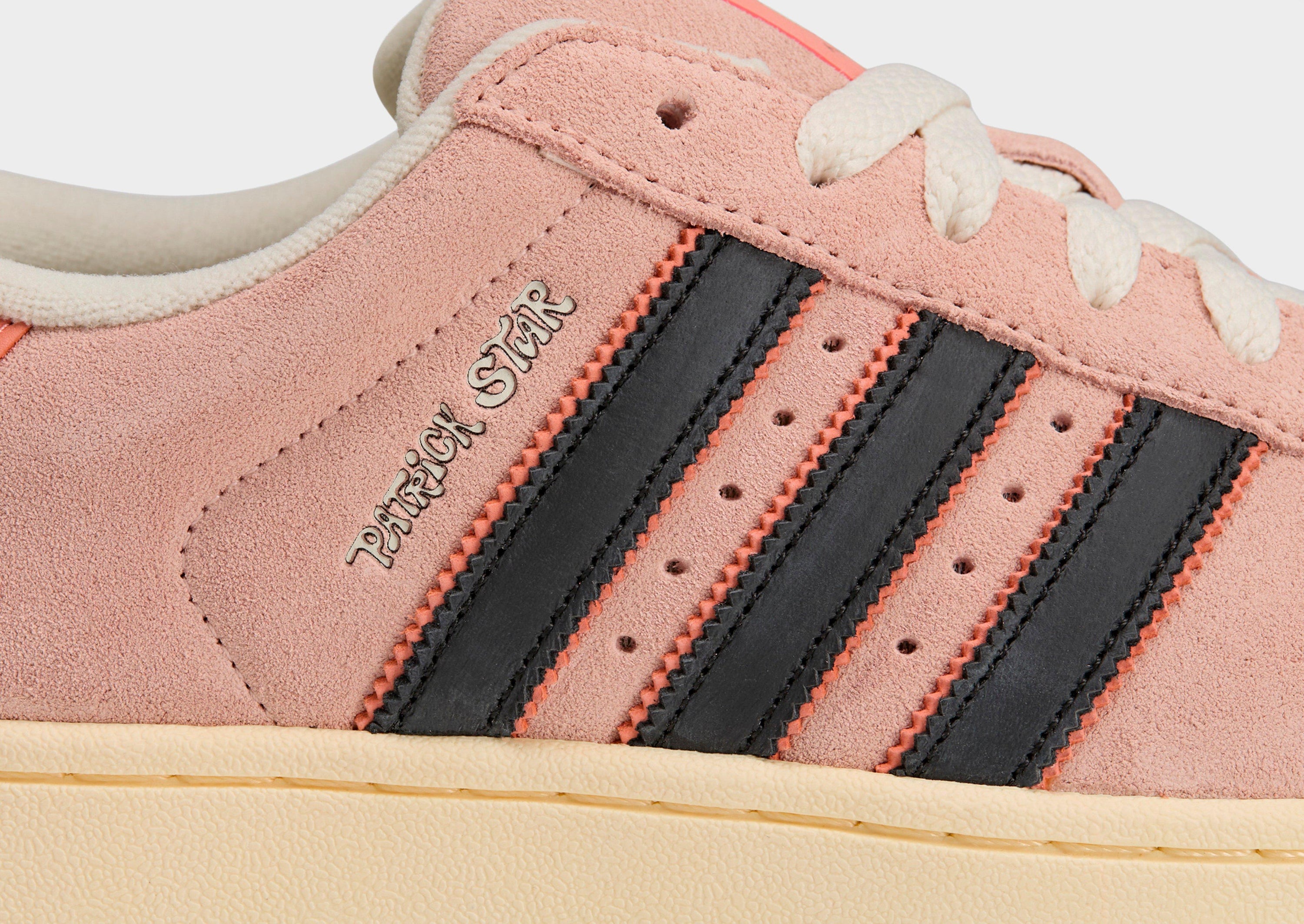 The SpongeBob SquarePants x adidas Superstar “Patrick Star” is a playful take on the iconic adidas Superstar silhouette, reimagined in tribute to Patrick Star from SpongeBob SquarePants. It features a soft pink suede upper evoking Patrick’s hue, contrasted with black 3‑Stripes and Wonder Clay accents, while the shell toe is rendered in a textured beige leather. The tongue is stamped with Patrick’s face and signature, the insoles carry co‑branding and a Bikini Bottom motif, and the translucent blue outsole mimics the underwater sky. With character‑inspired laces (green and purple floral shorts print) and classic Superstar structure, this collab blends nostalgia, fun, and streetwear heritage.